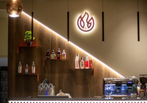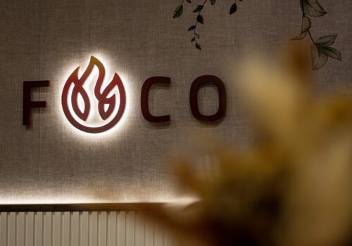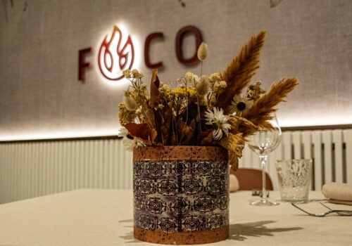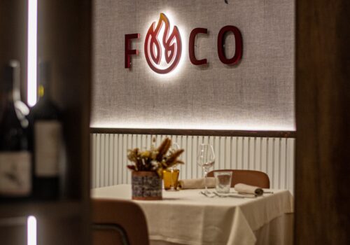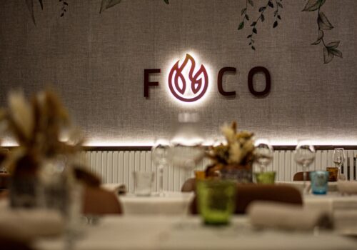 A definire lo stile sono i toni neutri e caldi, le sedute color cuoio, le tovaglie chiare e i dettagli che rendono l’ambiente immediatamente riconoscibile: una grande parete decorata con un motivo botanico e il logo “Foco”, illuminata da luci moderne che scaldano l’insieme senza appesantirlo.